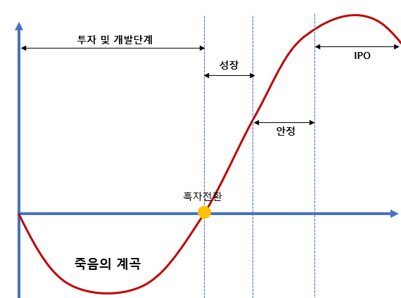‘데스밸리’는 사업 초기부터 성공적으로 자리 잡기까지의 굴곡 부위를 일컬으며 해당 그래프의 곡선을 J커브라고 지칭합니다.